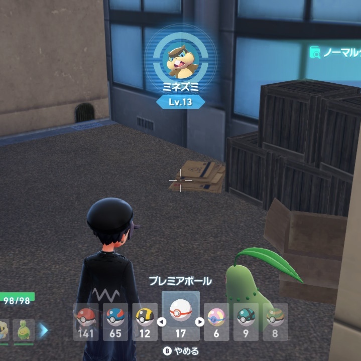 ☆ミネズミ 移動中の路地裏にて。これ、音を出さないでゲームしていて、何かないかなと行き止まりを見てカーソルが出たので二度見したら光るエフェクト出たので慌ててボール投げたのですよね…。今回ZAは色違いでも逃げられたら終わりなので一瞬の緊張感ですよ…。咄嗟に捕まえられて偉い!今になってスクショ見て気付きましたが、これは自然遭遇ではなくてベンチリセットの範囲だったんでしょうね。